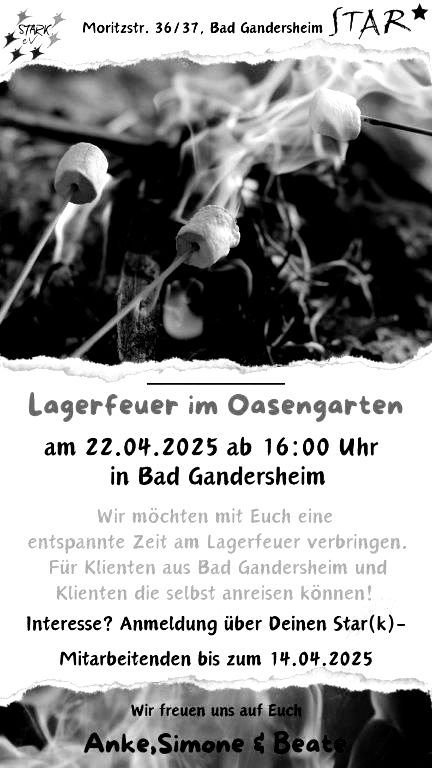 Wir möchten eine entspannte Zeit mit euch am Lagerfeuer verbringen. Anmeldung über deine*n Star-Mitarbeitende*n bis zum 14.04.25