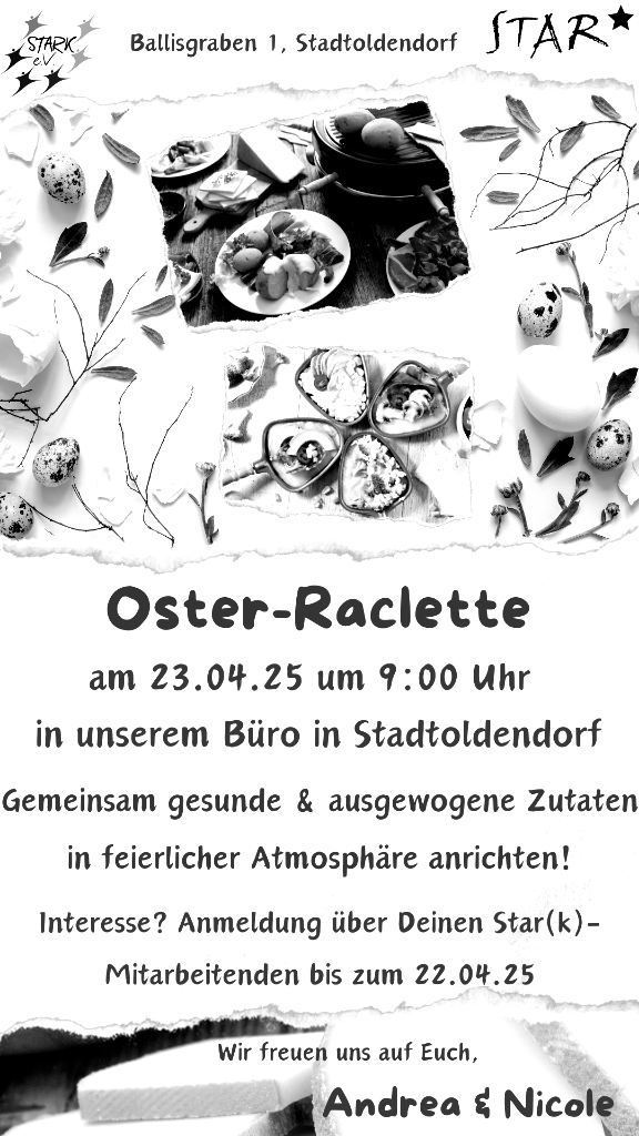 Gemeinsam gesunde & ausgewogene Zutatetn in feierlicher Atmosphöre anrichten. Anmeldung über deine*n Star-Mitarbeitende*n bis zum 22.04.25