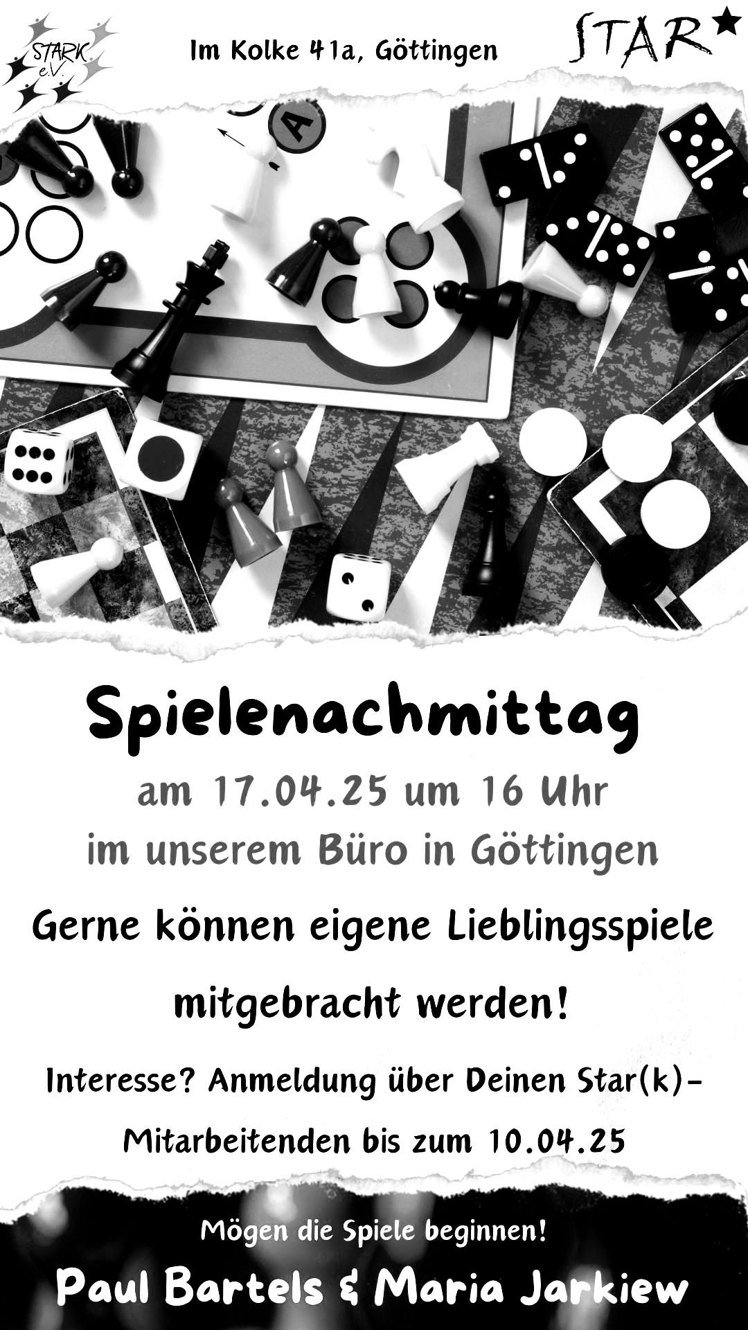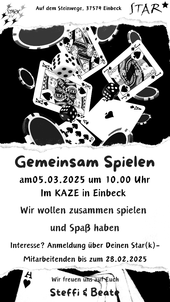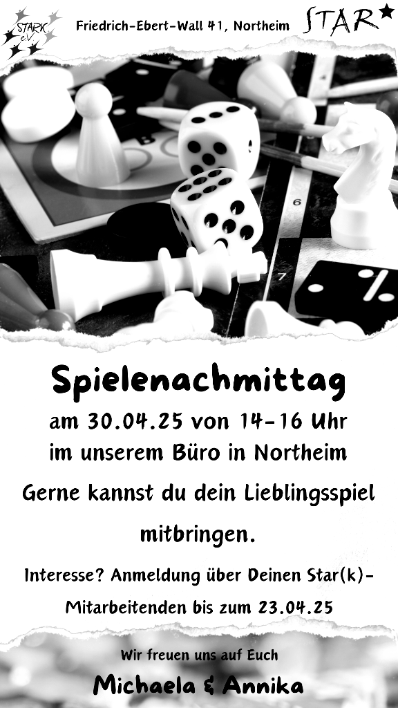 Gerne können eigene Lieblingsspiele mitgebracht werden. Anmeldung über deine*n Star-Mitarbeitende*n bis zum 10.04.25