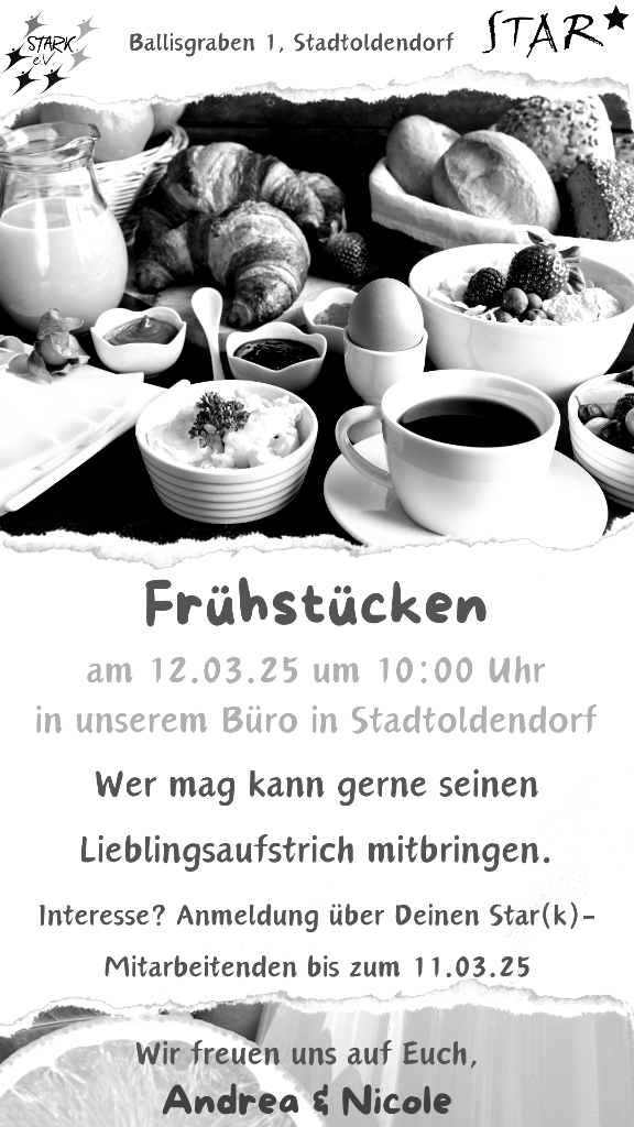 Wer mag kann gerne einen Lieblingsaufstrich mitbringen. Anmeldung über deine*n Star-Mitarbeitende* n bis zum 17.03.25