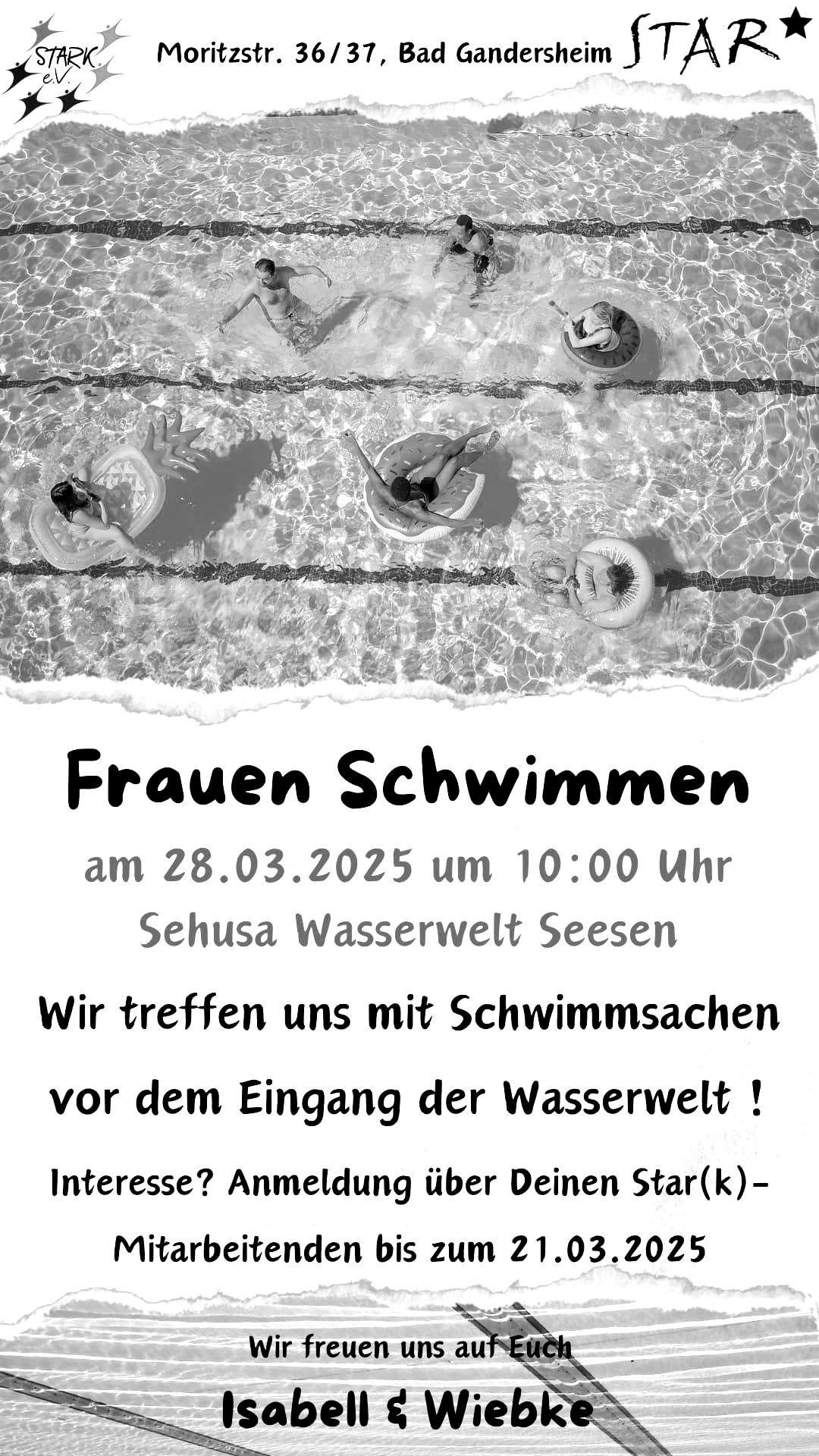 Wir treffen uns mit Schwimmsachen am Eingang der Sehusa Wasserwelt Seesen. Anmeldung über deine*n Star-Mitarbeitende* n bis zum 21.03.25