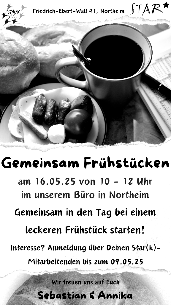 Gemeinsam in den Tag starten mit einem leckeren Frühstück. Anmeldung über deine*n Star-Mitarbeitende*n bis zum 09.05.25