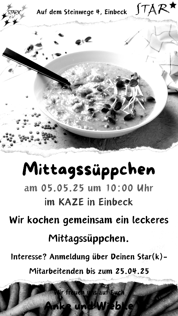 Wir kochen gemeinsam ein leckeres Mittagssüppchen. Anmeldung über deine*n Star-Mitarbeitende*n bis zum 25.04.25