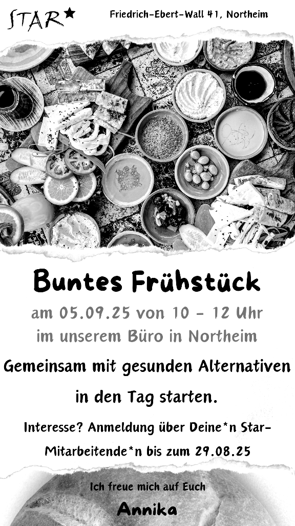 Lasst uns gemeinsam ein leckeres und gesundes Frühstück genießen. Anmeldung über deine*n Star-Mitarbeitende*n bis zum 14.04.25