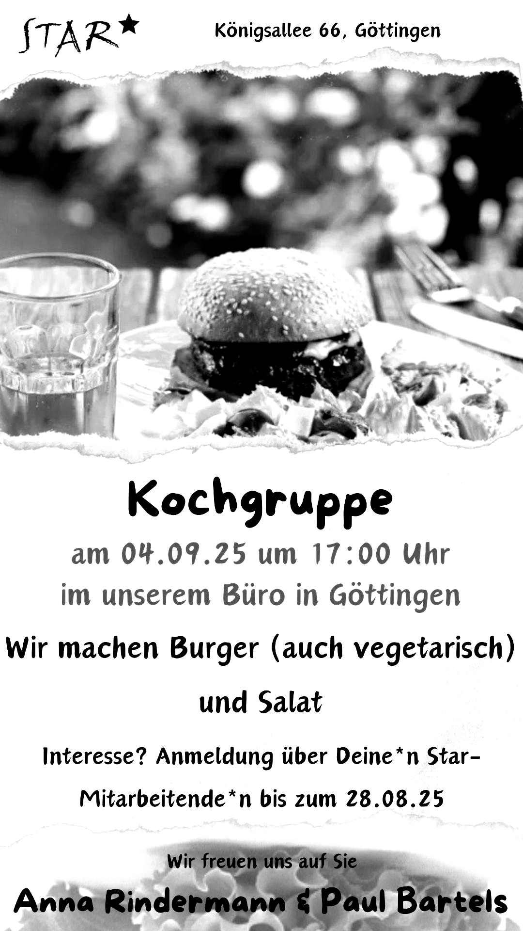 Wir machen Burger (auch vegetarisch) und Salat. Anmeldung über deine*n Star-Mitarbeitende*n bis zum 28.08.25
