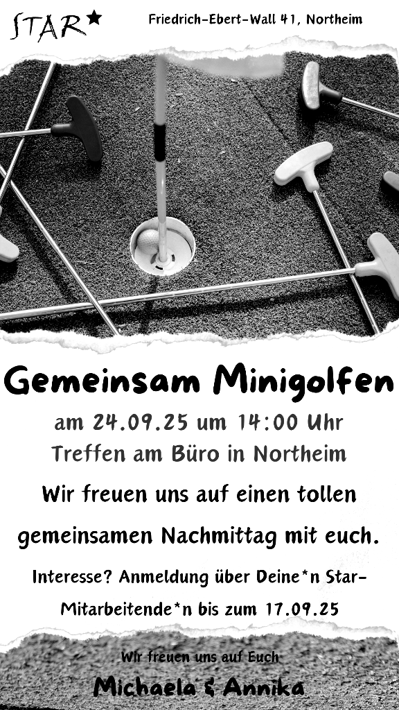 Gemeinsam möchten wir zum Minigolfplatz nach Wahmbeck fahren. Anmeldung über deine*n Star-Mitarbeitende*n bis zum 30.04.25