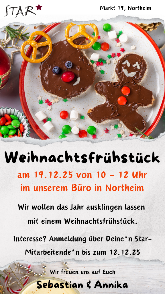 Wir wollen das Jahr gemeinsam bei einem Weihnachtsfrühstück ausklingen lassen. Anmeldung über deine*n Star-Mitarbeitende*n bis zum 12.12.25