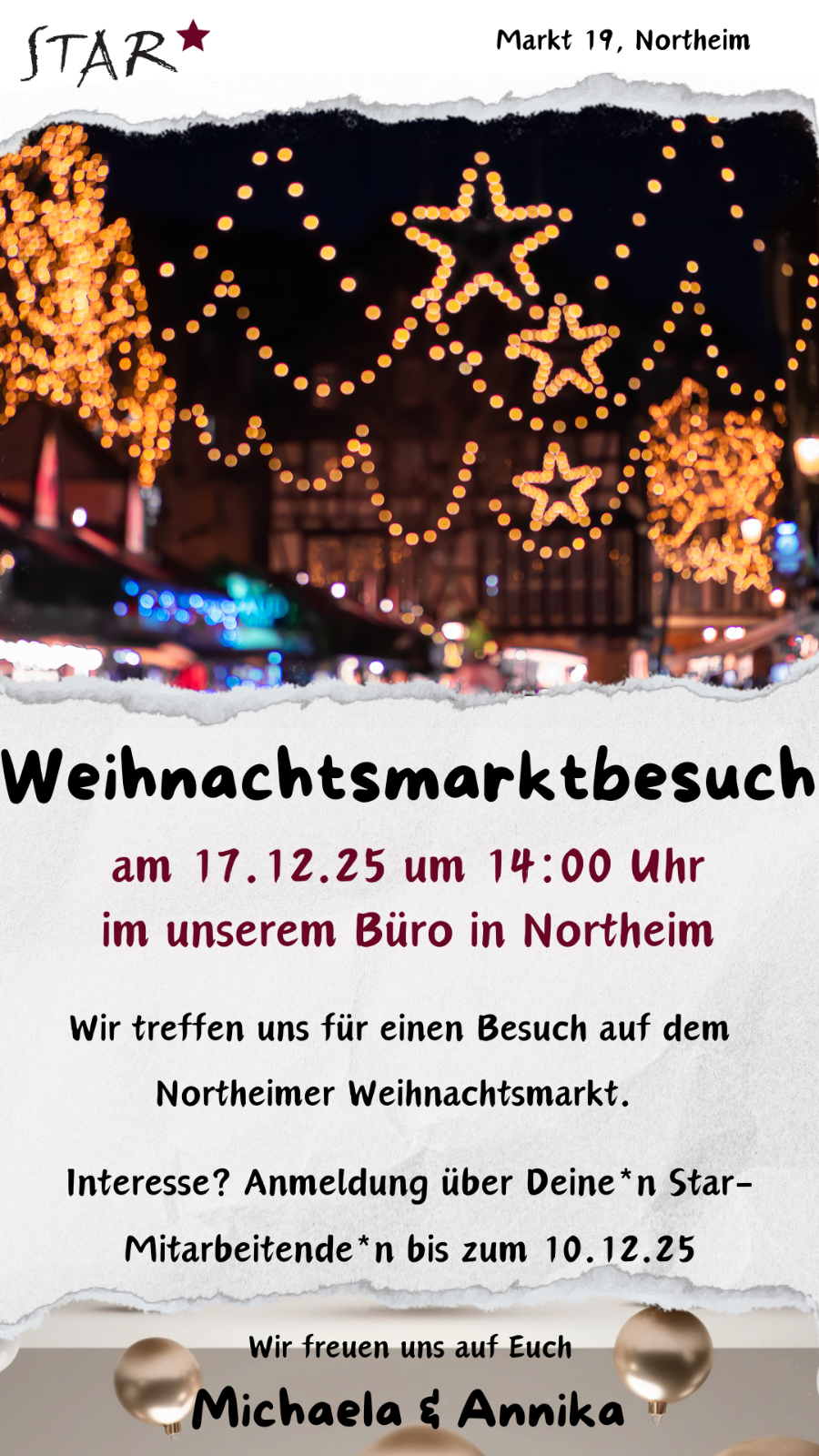 Wir treffen uns für einen Besuch auf dem Northeimer Weihnachtsmarkt. Anmeldung über deine*n Star-Mitarbeitende*n bis zum 10.12.25